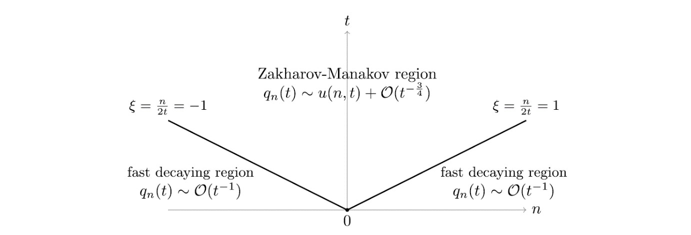 近期,九州(中国)青年教师陈美森博士与复旦大学范恩贵教授和深圳大学贺劲松教授在国际纯数学领域的顶尖期刊《Advances in Mathematics》发表了题为“Long-time asymptotics for the defocusing Ablowitz-Ladik system with initial data in lower regularity”的重要学术成果。论文引入一种dbar最速下降方法,旨在探讨初值在低正则条件下,散焦Ablowitz-Ladik方程初值问题解的渐近性。主要思路是借助分析反射系数的性质,将初值问题对应的Riemann-Hilbert问题转换为dbar-Riemann-Hilbert问题,并通过一系列的变换来处理,最终分析得到初值问题解的渐近展开式。结论中得出在中心区域(Zakharov-Manakov区域),误差项关于时间的衰减速度为t-3/4,与NLS方程情况相符,而在两边区域(快速衰减区域),其衰减速度为t-1。