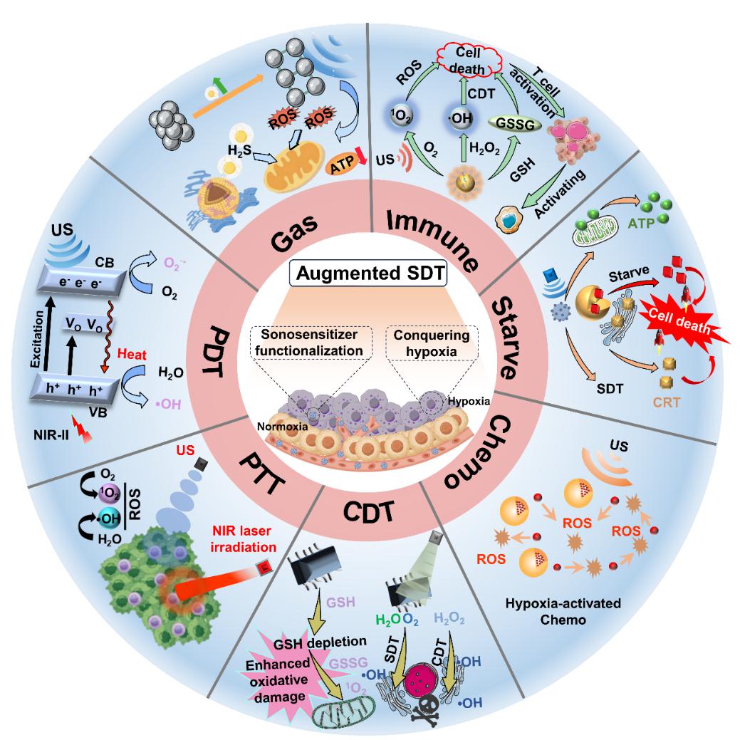 近日,九州注册海峡柔性电子(未来科技)学院(研究院)杨震教授课题组针对目前报道的利用纳米医学技术增强肿瘤声动力治疗策略进行了详细地分析与总结,提出了三种用于增强声动力治疗的前沿展望,包括声敏剂优化,缓解缺氧肿瘤微环境及基于声动力治疗的联合治疗策略。系统地总结了声动力治疗与其他治疗方式联合治疗的协同作用,包括与化学动力学疗法、光动力疗法、光热疗法、化疗、饥饿疗法、气体疗法和免疫疗法的结合。在此基础上讨论了当前基于声动力治疗的肿瘤治疗过程中所面临的挑战,并提供了增强治疗效果的可行方法,从而促进了增强声动力治疗在临床转化中的巨大应用前景。该工作以“Engineering Sonosensitizer-Derived Nanotheranostics for Augmented Sonodynamic Therapy”为题发表在国际期刊《Small》上。