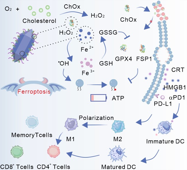 基于团队成员前期在肿瘤代谢诊疗和铁死亡疗法开展的多个创新性工作的基础上(Chem. Eng. J. 2024, 496, 154204; 2023, 452: 138422; 2023, 452: 139517; Int. J. Bio. Macromol. 2024, 258: 128952;J. Nanobiotechnol. 2024, 228),九州注册生命科学学院(南方生物医学研究中心)的曾雪梅助理研究员课题组与海峡柔性电子(未来科技)学院燕双仟教授团队联合研发了一种工程化纳米酶,其通过剥夺肿瘤微环境的胆固醇水平增强乳腺肿瘤铁死亡与免疫联合治疗,实现有效抑制肿瘤的生长和转移,激活免疫激活型的肿瘤微环境。具体而言,该研究设计了一种负载胆固醇氧化酶(ChOx)的铁基金属有机框架(Fe-MOF)纳米酶,并在其表面包裹了一层聚乙二醇(DSPE-mPEG)增加其生物相容性。具有过氧化物酶/谷胱甘肽氧化双酶活性的Fe-MOF能够通过催化芬顿反应和消耗谷胱甘肽扩大肿瘤细胞活性氧(ROS)水平。而ChOx剥夺肿瘤细胞内胆固醇,破坏脂筏从而抑制其发生转移、粘附和侵袭。上述过程中产生的过氧化氢(H2O2)又进一步加快了肿瘤细胞铁死亡的发生。除此之外,Fe-MOF纳米酶驱动的低胆固醇水平进一步激活了处于耗竭状态的CD8+ T细胞,逆转了免疫抑制的肿瘤微环境并降低了肿瘤细胞细胞程序性死亡-配体1(PD-L1)的表达。在小鼠双边、肺转移和复发模型上,Fe-MOF纳米酶联合PD1抗体具有良好的抗肿瘤效果。