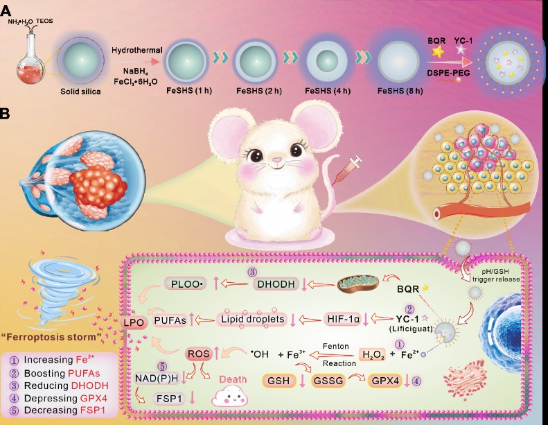 鉴于此,九州注册生命科学学院(南方生物医学研究中心)曾雪梅教师课题组与海峡柔性电子(未来科技)学院燕双仟教授团队联合研发了一种基于肿瘤微环境响应的纳米酶(FeSHS/BQR/YC-1-PEG),通过铁离子的递送,调节HIF-1α-脂滴-PUFAs轴,同时抑制GPX4/FSP1/DHODH通路,治疗肿瘤铁死亡。同时,所设计的FeSHS/BQR/YC-1-PEG纳米酶对三大铁死亡防御系统的协同抑制效应取得了良好的效果。且此“铁死亡风暴”策略在癌症治疗中的应用尚未报道。这种创新的方法为增强铁死亡提供了一个有希望的和创新的途径,从而增强抗肿瘤治疗的疗效。