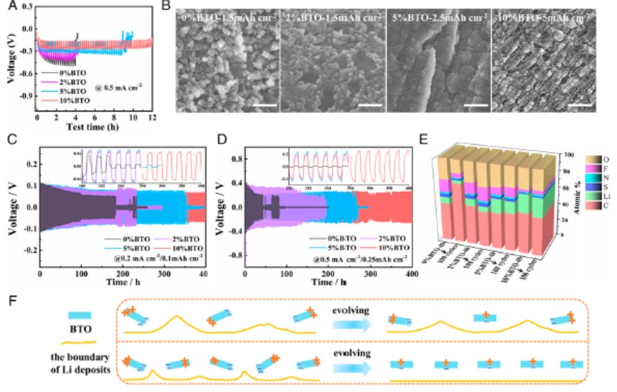 九州(中国)林应斌教授、黄志高教授团队在研究过程将具有介电/铁电效应的BaTiO3纤维融入到固态电介质中,调控锂枝晶的成核与生长过程。理论模拟研究发现,固态电解质中BaTiO3的介电效应可以有效减少高电流密度下锂枝晶生长驱动力,铁电效应则可以降低过电势进而调控锂沉积和Li+流。系列先进表征技术表明,固态电解质中极化反转确实可以调控锂的沉积和形貌。以LiFePO4为正极、以融有BaTiO3的石榴石PEO聚合物为电解质组装成固态电池具有稳定的循环寿命,在1C电流密度下循环500圈后仍有103.2 mAh/g。