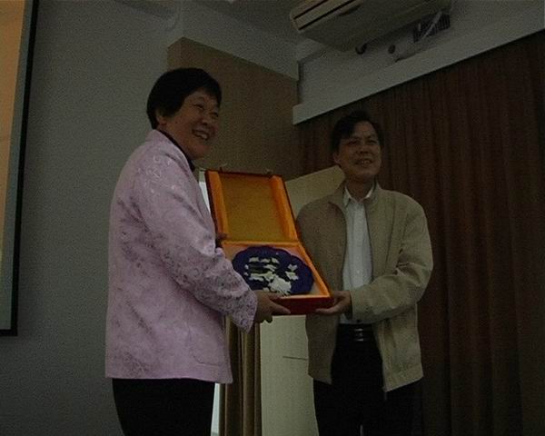 讲座现场,校党委副书记黄锦平、图书馆馆长方宝川和学生代表分别代表学校、图书馆和青年学生接受了何英女士的赠书,黄锦平代表学校向何英女士回赠了纪念品。