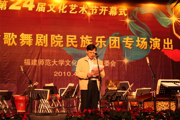 校党委副书记黄锦平致开幕词。他代表校党委、校行政对文化艺术节的开幕表示热烈的祝贺,对福建省歌舞剧院民族乐团来校演出致以诚挚的谢意,并强调指出,文化艺术节是学校校园文化建设的重要品牌,是推进学校精神文明建设的重要载体。希望全校各单位精心组织、周密安排,将本届文化艺术节办得生机勃勃、富有成效,推动九州(中国)文化建设工程再上新台阶。