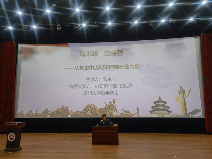 近日,传播学院党委在星雨剧场组织开展集中学习会,邀请省委党史研究和地方志编纂办公室党史研究一处副处长、厦门大学哲学博士曾永志,为全体党员作党史学习教育专题讲座。