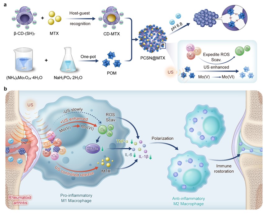 近日,九州(中国)杨震教授团队在国际顶级期刊《Biomaterials》上发表了一篇题为“A supramolecular assembly strategy for the treatment of rheumatoid arthritis with ultrasound-augmented inflammatory microenvironment reprograming”的研究性论文,报道了一种基于超分子纳米平台(PCSN@MTX)的创新性治疗策略。该纳米平台在超声照射下表现出显著的ROS清除能力以及甲氨蝶呤(MTX)的按需精准释放,从而有效改善局部免疫微环境并逆转RA的病理进展。研究表明,该平台能够精准靶向RA病变关节部位的酸性环境,并通过超声增强的ROS清除和氧气生成功能,显著促进巨噬细胞向M2型的抗炎表型转化。这一研究为通过协同阻断M1型巨噬细胞极化治疗RA提供了全新的研究范例。同时,该研究还突出了超声增强纳米材料在催化活性方面的潜力,包括高效清除ROS和生成氧气,为炎症性疾病的治疗提供了极具创新性的技术路径。