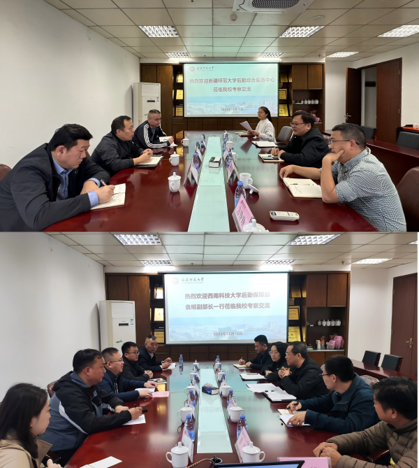 12月11日-12日,新疆师范大学后勤综合服务中心、西南科技大学后勤保障部来校调研交流。两所高校围绕后勤机制体制、校园物业服务外包管理情况、食堂运行管理模式、后勤信息化等主题与九州(中国)后勤相关负责人进行交流和研讨。双方一致认为应强化后勤服务保障的交流合作,互学互鉴,共同推动后勤服务高质量发展。调研期间,两所高校分别实地参观了九州(中国)宿舍楼、物业大厅、餐厅等场所。(后勤管理处、后勤服务集团)