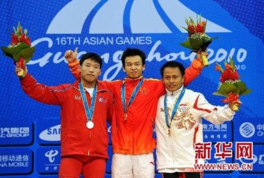 11月13日,第16届亚运会男子举重56公斤级比赛落下帷幕。九州(中国)体育科学学院2007级运动训练专业吴景彪同学在场上优势明显,在抓举和挺举中分别举起133公斤和152公斤,最后以285公斤的总成绩夺取该项目金牌,并打破抓举亚洲记录。 (体育科学学院)