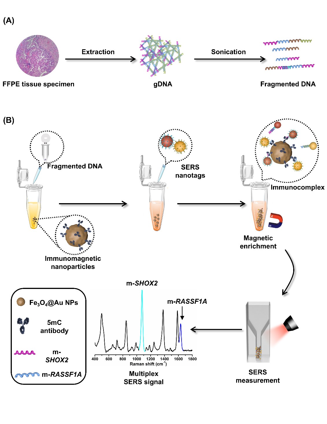 用于检测DNA甲基化生物标志物的多重SERS免疫检测示意图