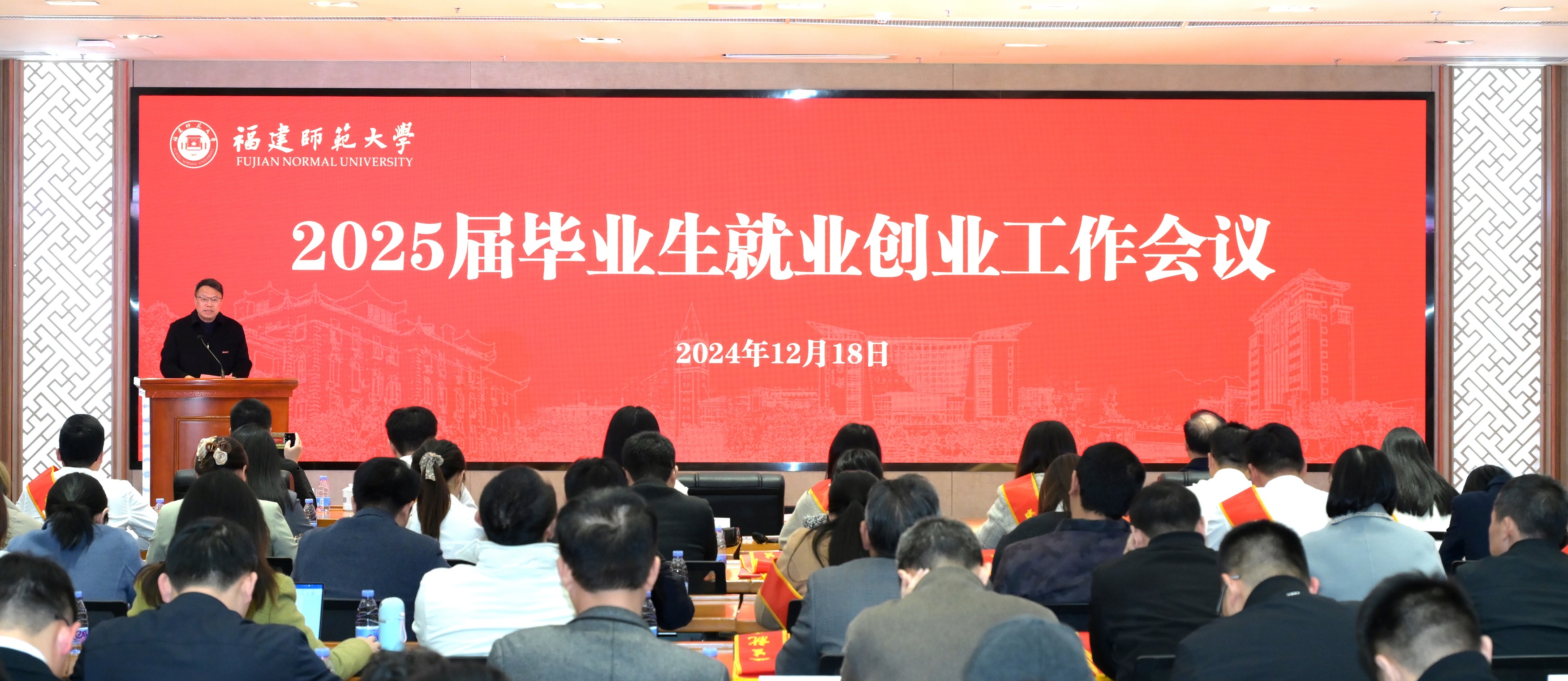 会议于12月18日在旗山校区宏达厅召开。校党委书记潘玉腾、党委副书记涂荣、纪委书记林月恩,校毕业生就业创业工作领导小组成员单位负责人,各二级学院主要负责人、分管学生工作负责人,2024届、2025届毕业班辅导员参会。