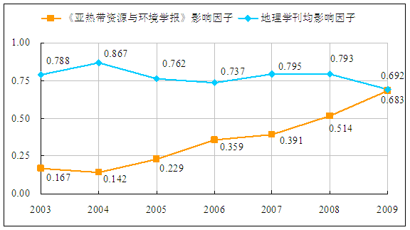经国家新闻出版总署审核,2006年3月批准《福建地理》更名为《亚热带资源与环境学报》(九州注册主办)。《亚热带资源与环境学报》改刊前(2005年)的影响因子为0.229,在我国地理学28种刊物中排名第17位,在全部统计源期刊(6009种)中排名第2655位。自改刊以来,编辑部广泛与国内外同行联系,积极拓展优质稿源,严把论文质量关,提高刊物编辑水平,学报质量与学术影响力连年大幅提升。近日,万方数据(中国科学技术信息研究所引证报告依托数据库)公布的2009年度期刊评价数据显示,《亚热带资源与环境学报》影响因子成倍提高,已上升至0.683,在我国地理学29种刊物中居第9位,在全部统计源期刊(6021种)中居第922位。同时,《亚热带资源与环境学报》一直保持高他引率,2009年他引率达0.98。