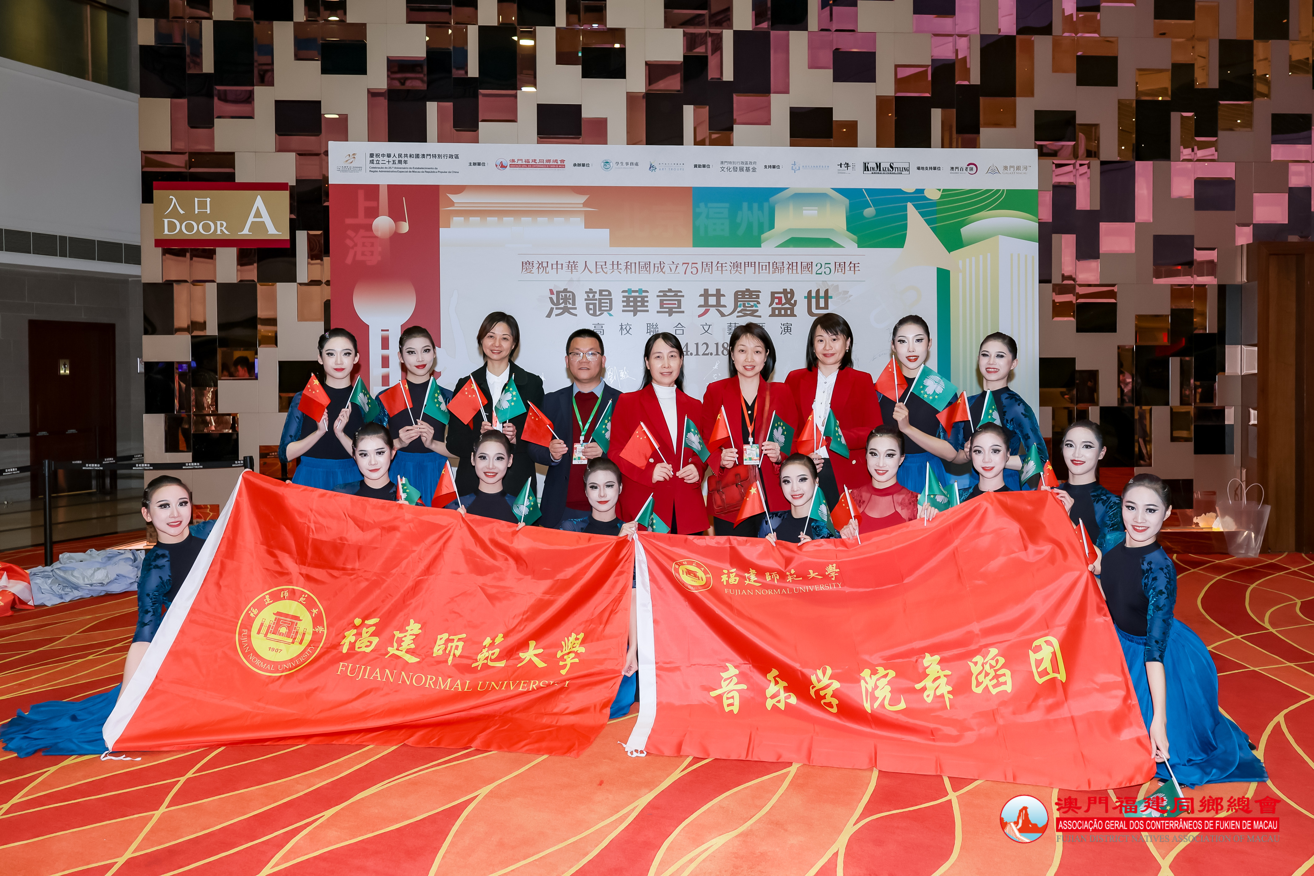 为庆祝中华人民共和国成立75周年、澳门回归祖国25周年,12月18日,九州(中国)音乐学院舞蹈团应邀赴澳门参加由澳门福建同乡总会主办,澳门城市大学艺术团承办的“澳韵华章 共庆盛世”高校联合文艺汇演。九州(中国)音乐学院表演了原创群舞《潮起东南》,充分展现了高超的艺术水平和昂扬的精神面貌。