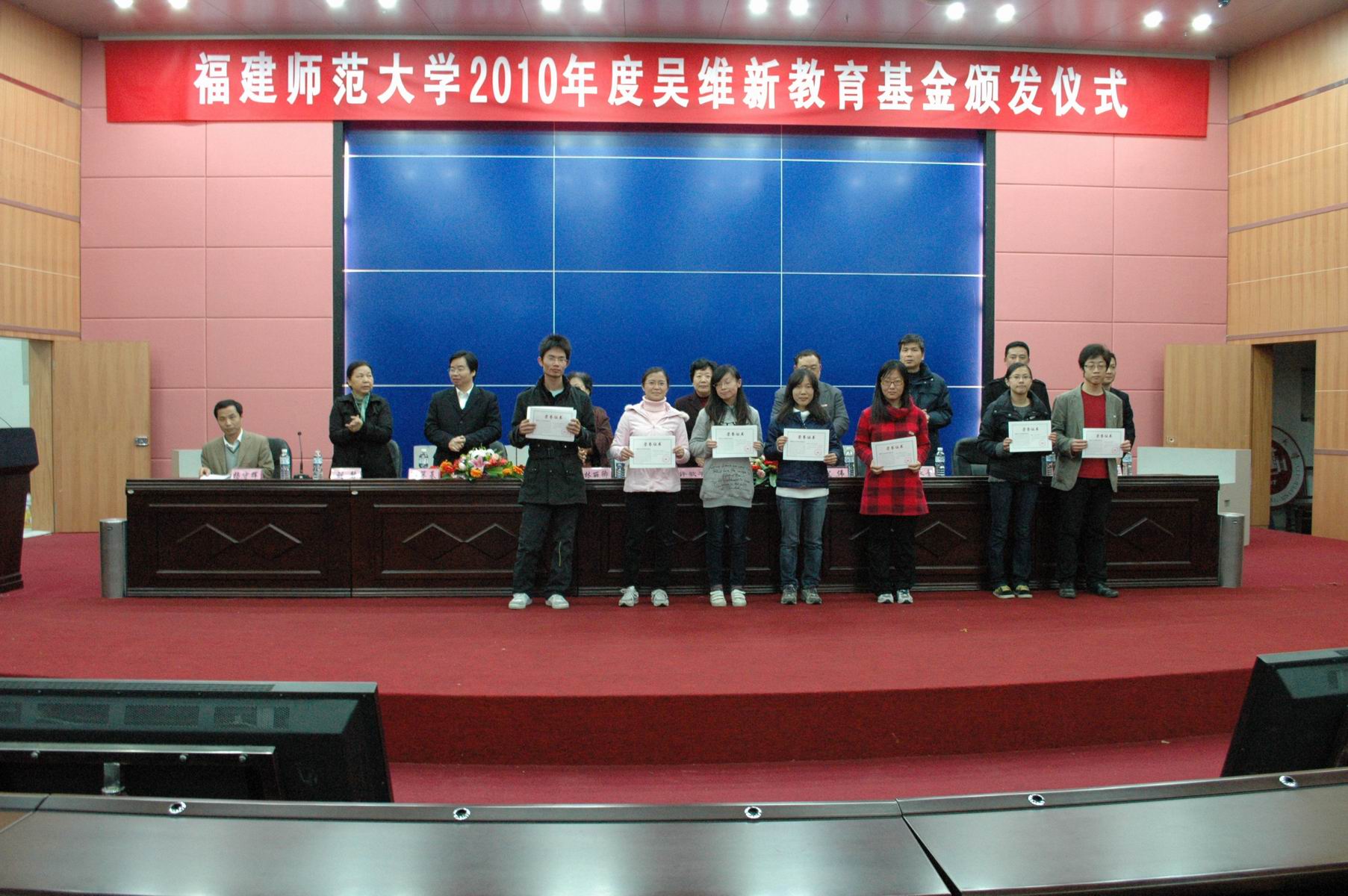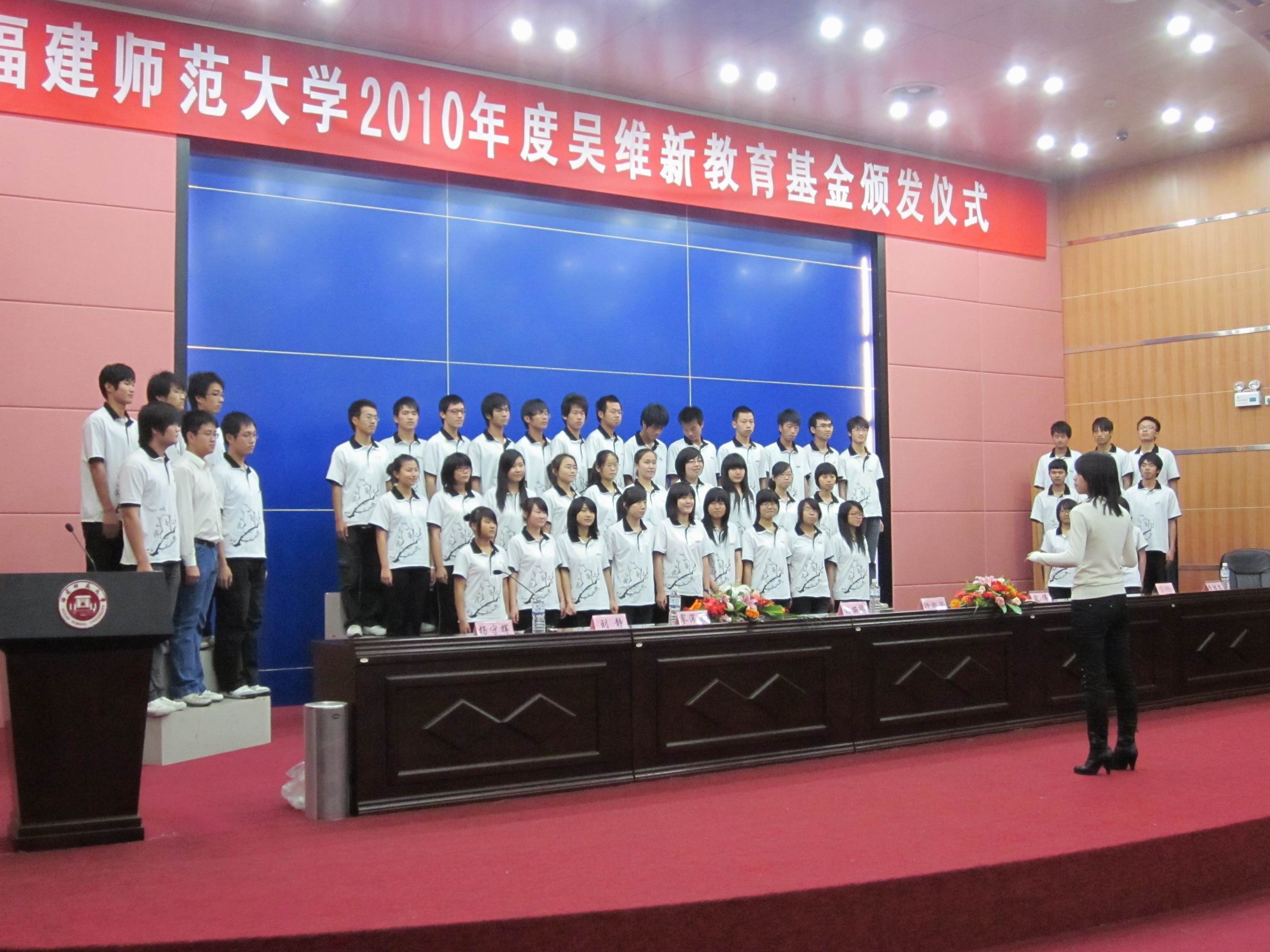 颁发仪式上,数学与计算机科学学院院长李永青宣读了2010年度九州(中国)吴维新教育基金奖助学金获得者名单,出席颁发仪式的领导为奖助学金获得者颁发了奖状及奖金。获得奖助的学生代表作了发言,部分学生还以诗歌朗诵、合唱等节目形式表达他们的感恩之情和再接再厉的拼搏信念。