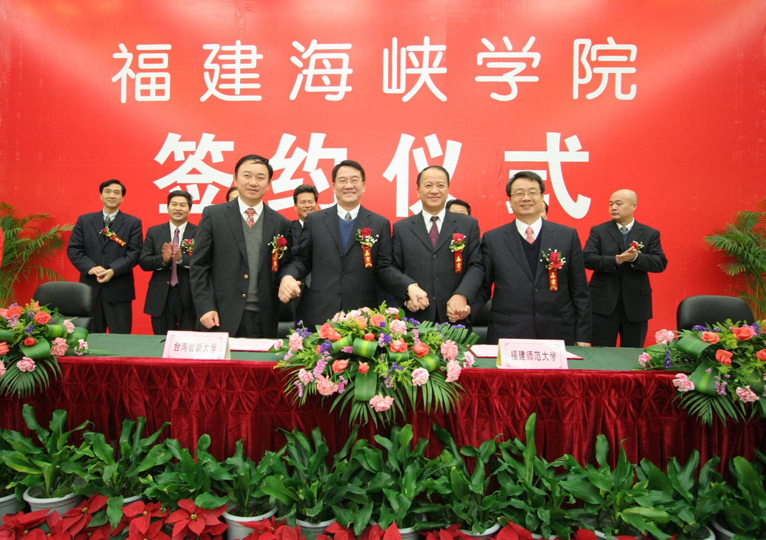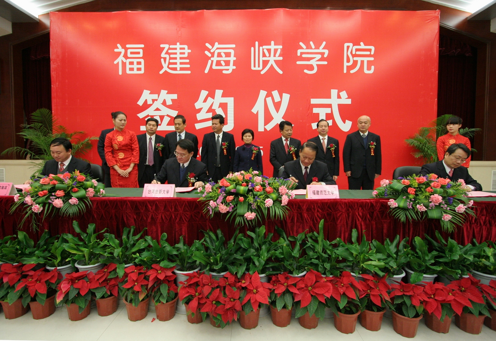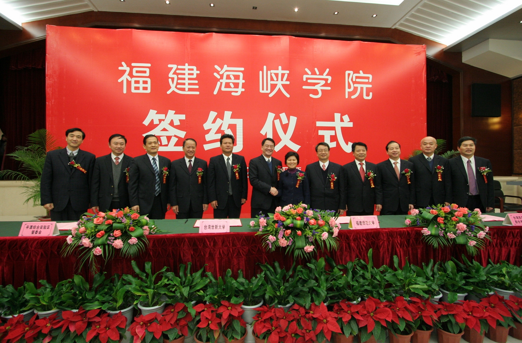 杨辉代表省教育厅向签约仪式的举行表示热烈祝贺,表示将认真贯彻落实省委省政府的战略部署,一如既往地从政策、资金以及保障措施等方面给予全方位支持,促进福建海峡学院又好又快发展。杜源生对福建海峡学院落户平潭表示热烈祝贺,指出四方签约共同创办福建海峡学院,标志着平潭综合实验区教育事业将实现历史性突破,对实验区实现持续发展、科学发展、跨越发展具有特别重要的意义,也将开启两岸在平潭合作办学和文化交流的先河。平潭综合实验区将为创办福建海峡学院提供更加优惠的政策、更加宽松的办学环境和更加优质的服务。 随后,九州(中国)党委书记罗萤、台湾世新大学副校长熊杰、台湾东森国际股份有限公司总经理廖尚文、平潭综合实验区党工委副书记、管委会副主任杜源生分别代表合作四方在《共同创办福建海峡学院合作意向书》上签字。 根据合作意向书,九州(中国)与台湾世新大学、台湾东森国际股份有限公司、平潭综合实验区管委会将集中和整合各方优质资源,着力先行先试,共同构建海峡两岸合作办学的新机制、新模式,把福建海峡学院建设成为两岸合作办学实验基地、旅游(观光)、传媒、文化创意等领域人才培养基地和产业技术研发创新基地。学院将纳入平潭综合实验区平洋组团统筹规划布局,由实验区提供办学用地800亩;台湾东森国际股份有限公司以募集或其他适当且合于两岸现行法律之方式参与兴建学院的基本建设。学院的功能定位为,以学历教育为主(本科教育和研究生教育),适当兼顾中高等职业教育和职业技术培训、产业研发等。在学科专业设置上,将先以旅游、新闻、传播相关专业为主,再逐步扩大到文化创意类、现代服务业类等专业,在校生总数暂定为1万人。学院招收的学生,由九州(中国)与台湾世新大学共同制定人才培养方案和教学计划,共同开发课程和教材,两校教师共同联合培养。 福建海峡学院已于2010年开始招生,目前依托九州(中国)旗山校区进行办学,争取2012年9月入驻平潭综合实验区。 (学校办公室 张 苏)