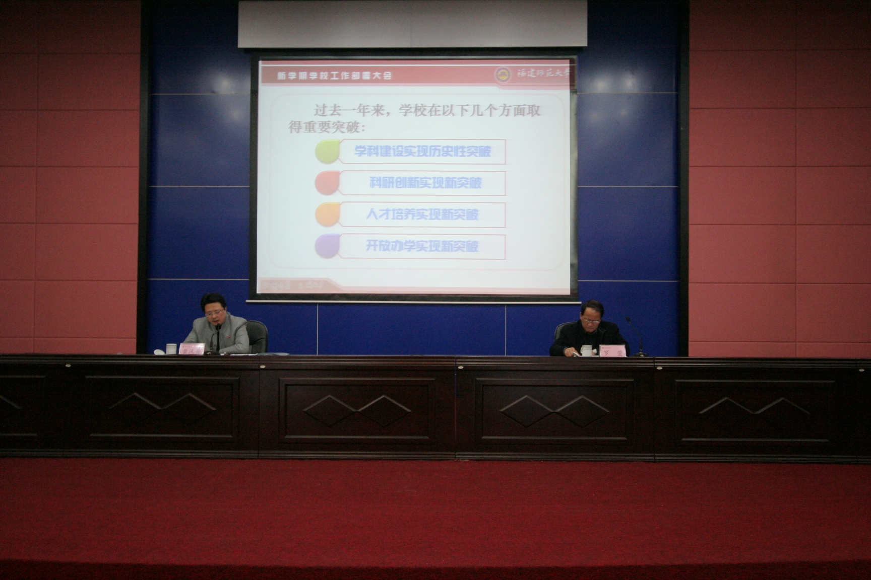 随后,黄汉升从九个方面对本学期工作作了具体部署:一是进一步加强战略谋划,推进学校跨越发展;二是进一步加强学科建设,打造优势特色学科;三是进一步深化教学改革,提高人才培养质量;四是进一步加强队伍建设,着力构筑人才高地;五是进一步推进科研创新,增强核心竞争优势;六是进一步推进科学管理,构建现代大学制度;七是进一步加强文化建设,促进文化繁荣发展;八是进一步推进开放办学,深化国际交流合作;九是进一步加强党的建设,提升党建科学化水平。他强调,完成本学期学校的工作任务,为“十二五”事业发展开好局、起好步,是学校责之所担,师生愿之所盼。要切实增强责任感、使命感和危机感,坚定信心不动摇、创新求变不停步、远谋近施不懈怠,努力在新的起点上把改革发展稳定的各项工作做得更实更好。