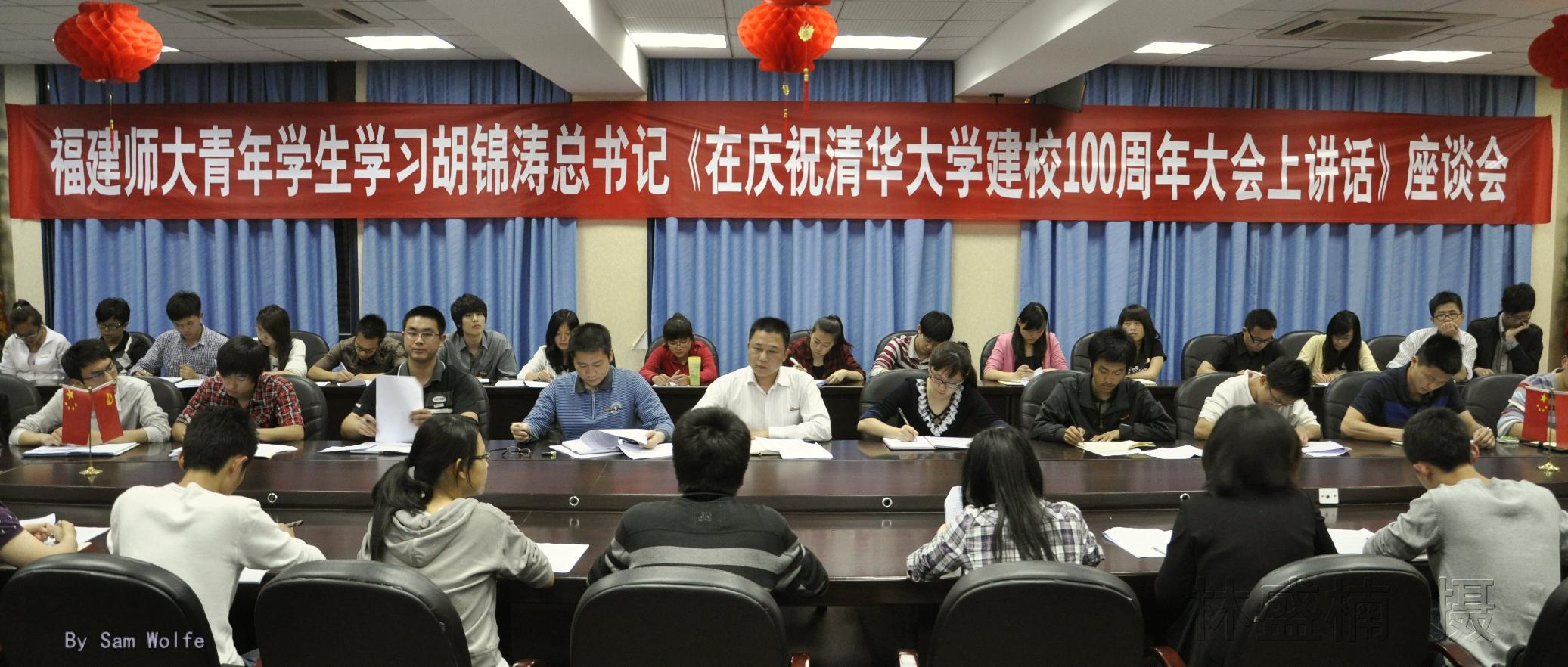 座谈会上,同学们集体重温了4月24日胡锦涛总书记的讲话视频,一致认为,总书记的重要讲话高屋建瓴,饱含深情,对青年学生的成长寄予了殷切期望,为高等教育的进一步发展指明了方向。从总书记的讲话中,深切地感受到当代大学生的责任和使命。同学们纷纷表示,要珍惜美好的青春年华,努力提高科学文化素质和思想品德修养;要满怀爱国之心,时刻把国家装在心里,把爱国热情转化为勤奋学习、刻苦钻研、报效祖国的实际行动;要志存高远,脚踏实地,立为国奉献之志,立为民服务之志,把个人成长成才自觉融入祖国和人民的伟大事业之中,为海西发展、祖国腾飞奋斗、奋斗、再奋斗!