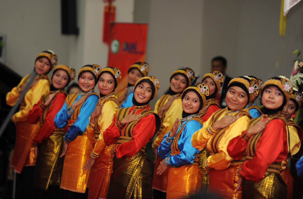 学生们表演了精彩的民族歌舞。孔子学院学生中文合唱团声情并茂地表演了唐诗诵唱《早发白帝城》,并与温家宝总理共同演唱了印尼民歌《哎哟妈妈》,全场响起阵阵掌声。