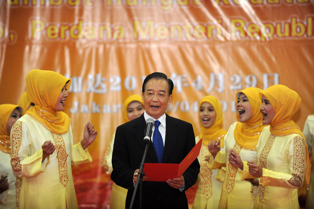 温家宝总理与孔子学院学生合唱团共同演唱印尼民歌《哎哟妈妈》