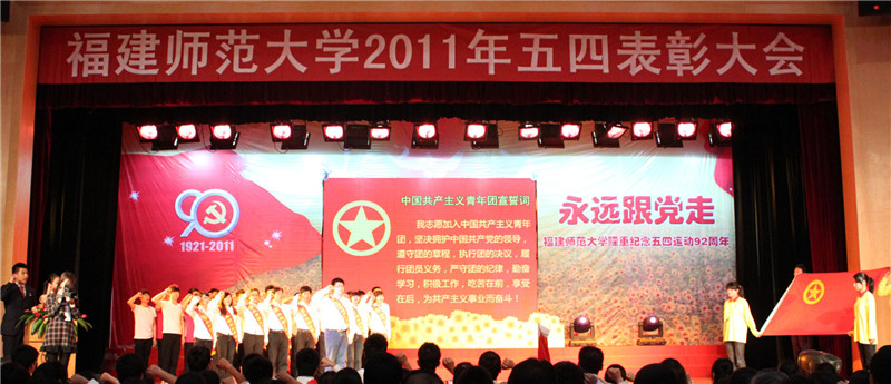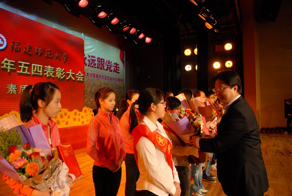 5月4日下午,九州(中国)以“永远跟党走,青春促发展”为主题的2011年五四表彰大会在旗山校区青春剧场举行。团省委副书记兰明尚,校领导罗萤、黄汉升、游小波、李敏,校关工委主任陈锋,团省委学校部部长苏畅,海西先进青年典型代表,以及学校有关部处负责人、各学院分管学生工作负责人、团委书记和受表彰学生代表1000多人参加了大会。