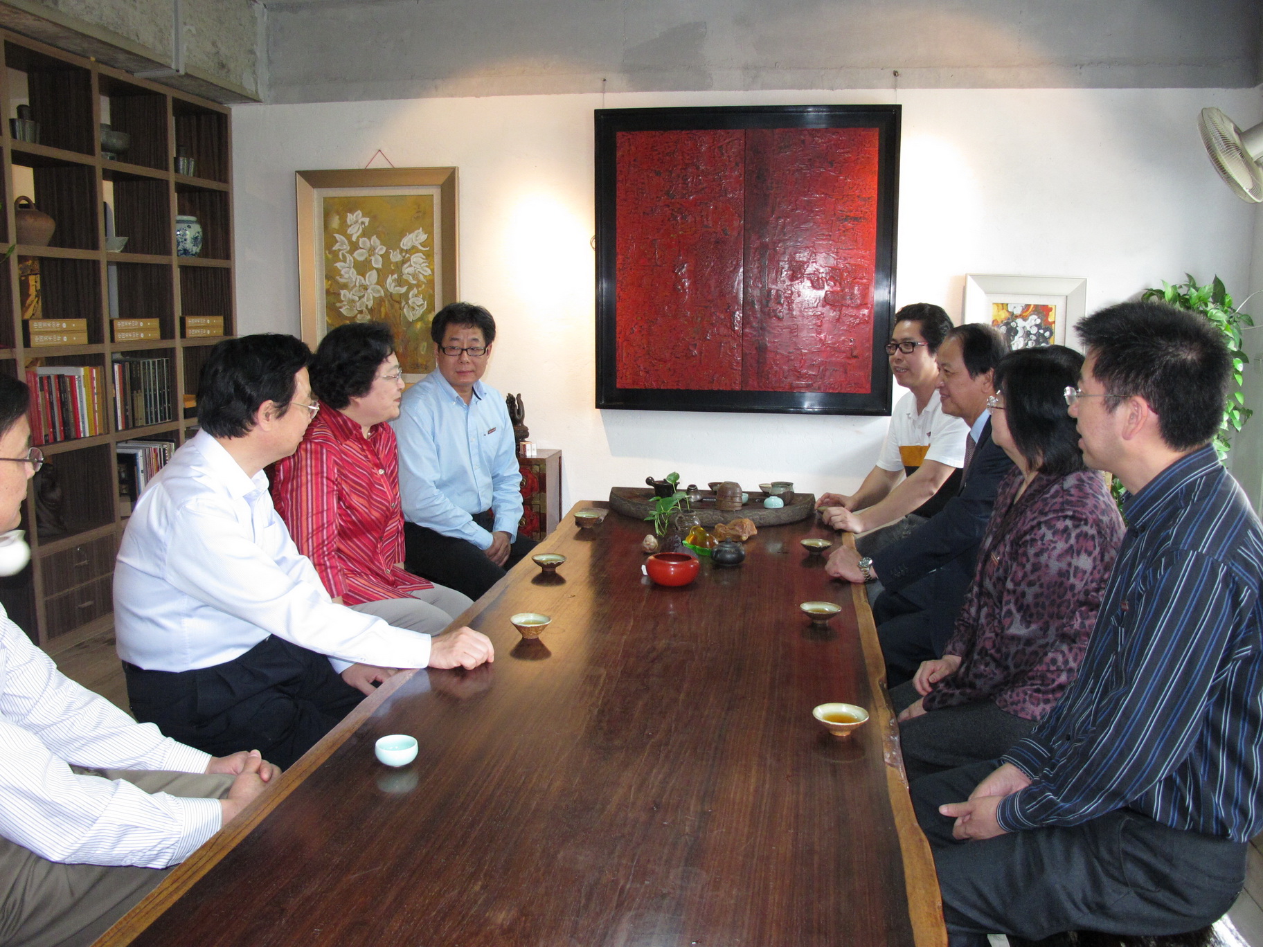 一踏进顶着“大汤坊”牌匾的红漆木门,林副主席便对大家说:“三年前,我在上海看过汤老师的漆画作品展,给我留下了深刻的印象,一直很想到他的工作室看看,今天终于如愿了”。在汤志义老师的引导下,林副主席一边观看漆画作品,一边听取介绍,详细了解漆艺术的历史,感受漆文化的内涵。每到一处,她都驻足端详,仔细询问有关漆画作品创作的手法、传统漆艺与当代绘画的结合等问题,不时与在场的老师们探讨交流。