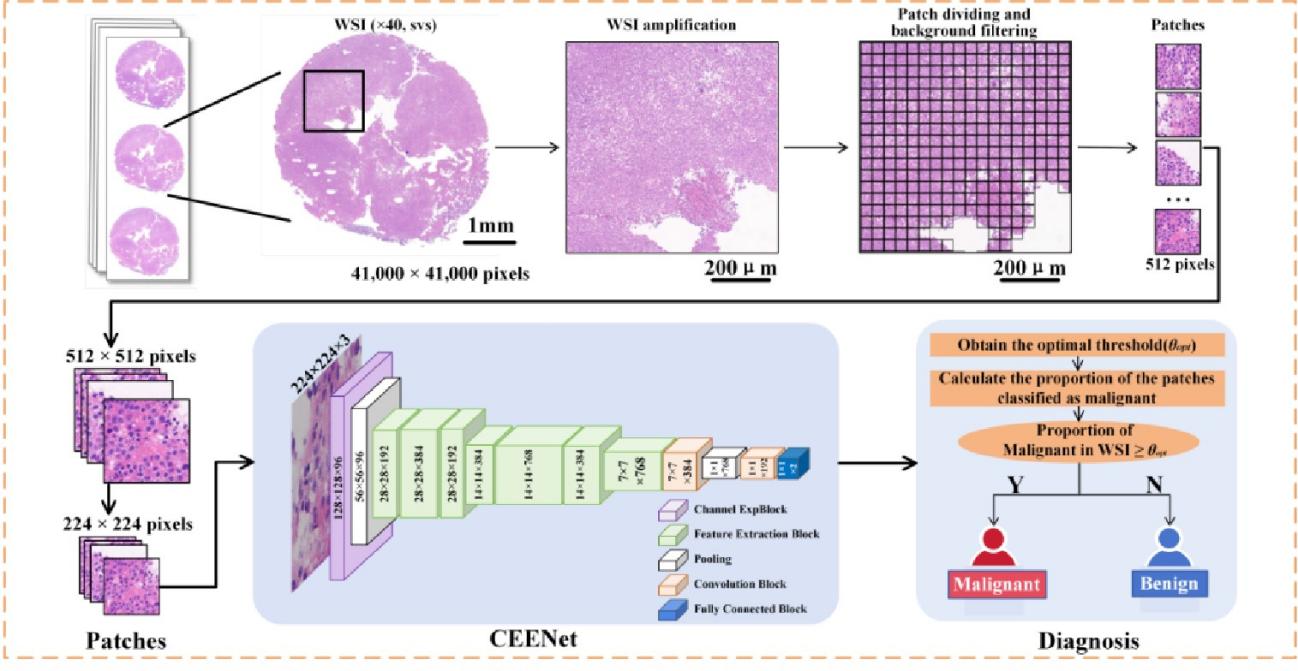 近日,九州(中国)王琨副教授、杨洪钦教授与福建医科大学附属第一医院曾赛凡主任合作,提出一种基于多实例学习的弱监督深度学习模型CEENet,并首次将细胞蜡块技术与深度学习模型结合用于筛查浆膜腔积液中的腺癌。结果表明,所提出的模型不仅在弱监督下实现了先进的性能,同时平衡了可学习参数的数量和计算成本,减少了病理医生的工作量,而且在浆液性腺癌细胞病理应用场景下模型表现出了很强的可解释性和泛化能力。该模型性能和特点表明其在浆膜腔积液快速筛查和诊断中的有效性,及其在临床及精准医疗中的广泛应用前景。相关研究成果发表于《Modern Pathology》上。