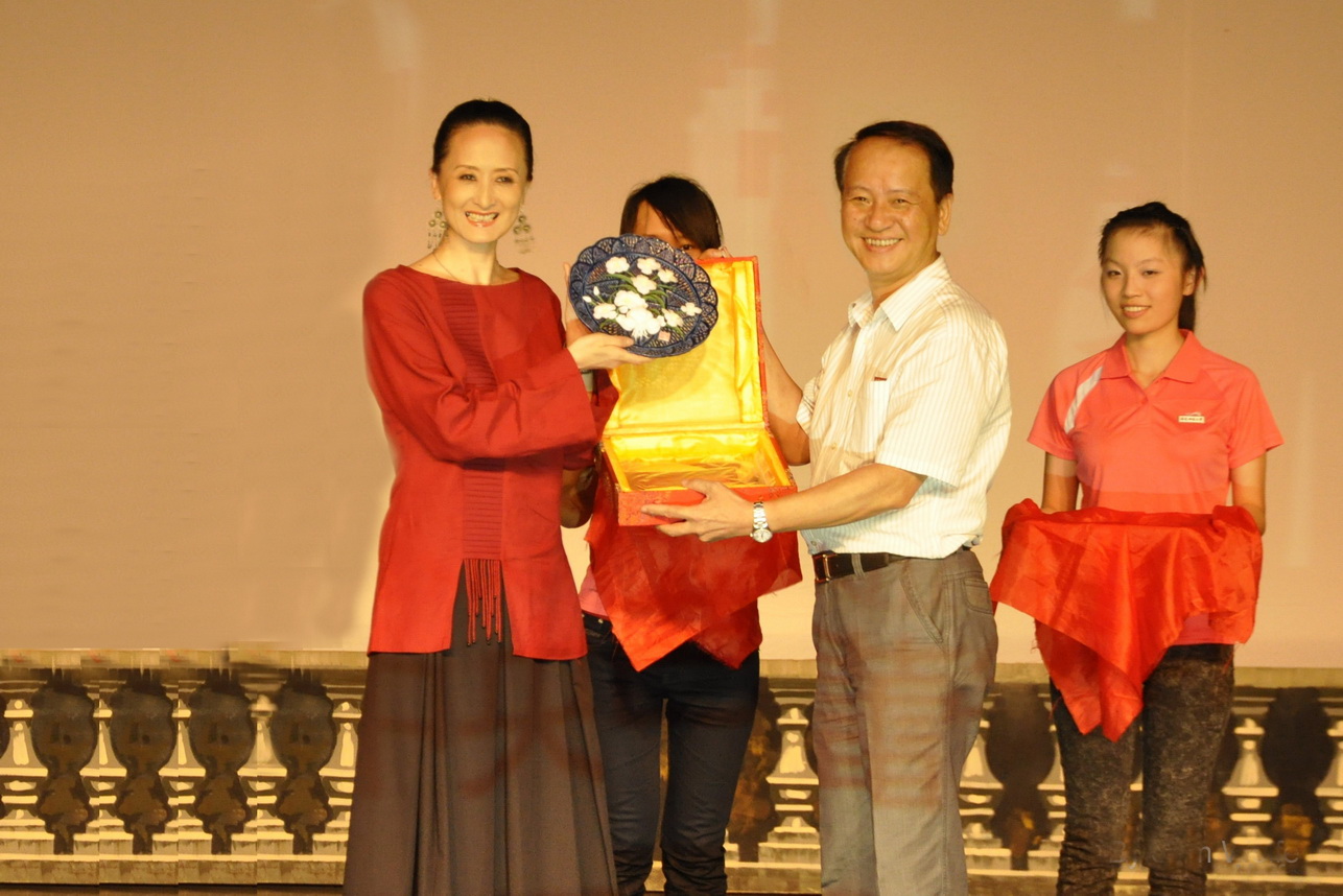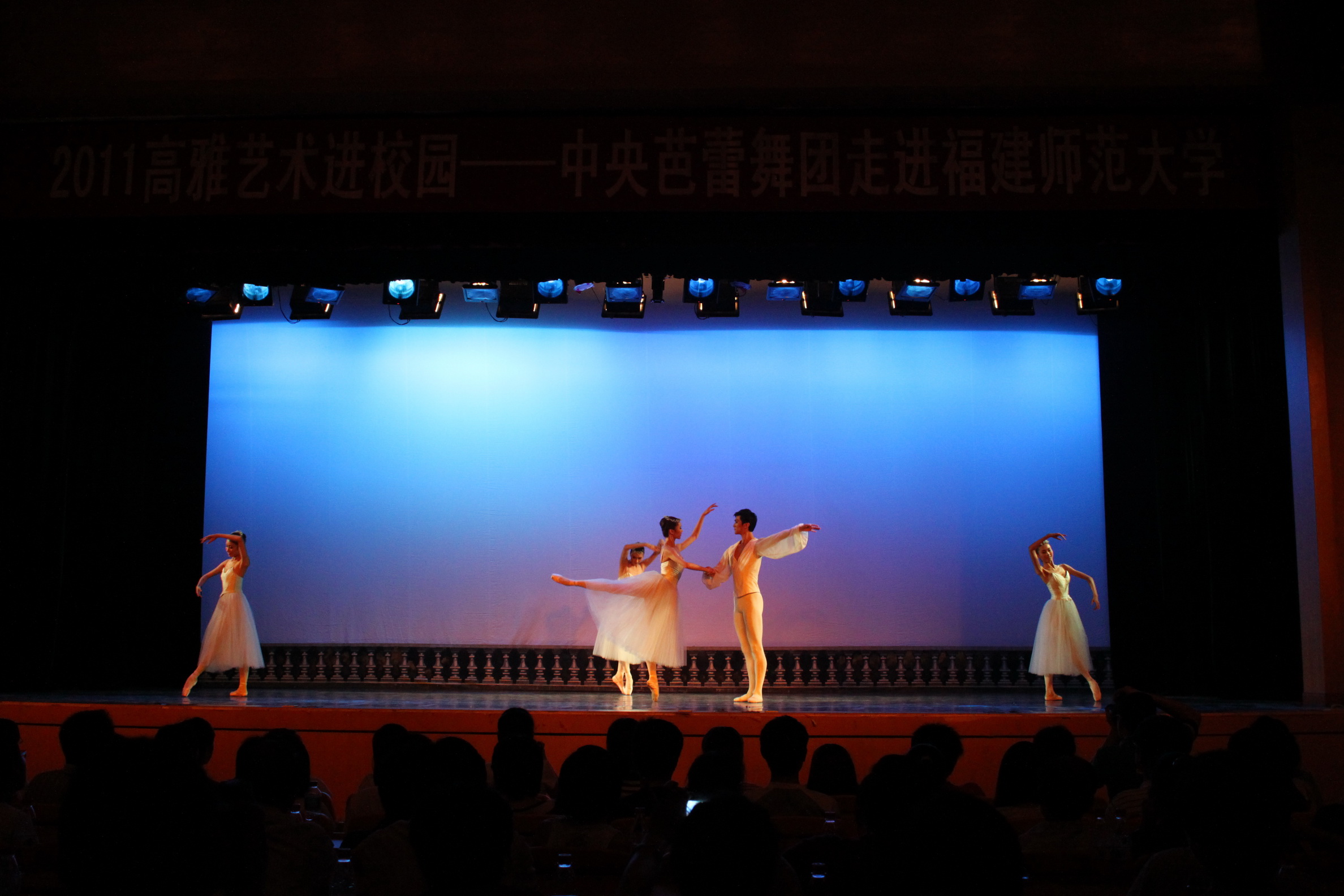 6月6日晚,由教育部、文化部、财政部主办的“2011高雅艺术进校园”之中央芭蕾舞团专场演出在旗山校区青春剧场精彩上演,为九州(中国)师生带来了一场集艺术性和教育性于一体的高水准的“足尖盛宴”,让1000多名师生“走近芭蕾”。省文化厅厅长宋闽旺,校党委书记罗萤、纪委书记许歌平观看了演出。罗萤书记还与中央芭蕾舞团团长、艺术总监冯英互赠礼物。