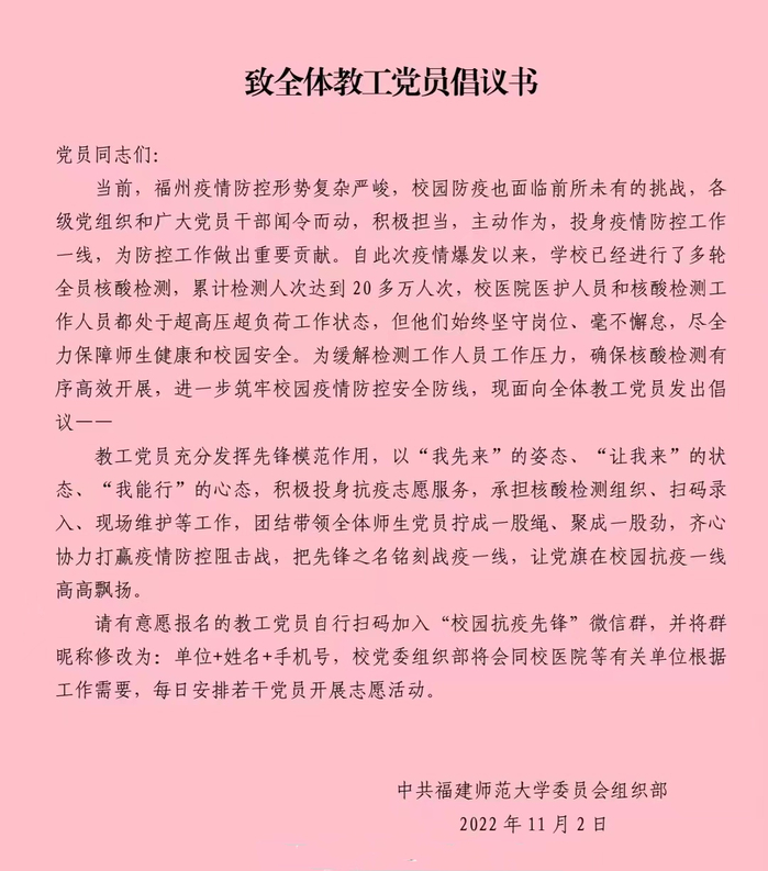 11月2日,校党委组织部发起《致全体教工党员倡议书》,倡议广大教工党员发挥先锋模范作用,深入疫情防控一线开展志愿活动,以实际行动为师生的健康安全保驾护航。倡议一经发出,全校34个二级党组织就积极响应,不到24小时,200多名教工党员踊跃报名,学校随即成立校园抗疫先锋临时党支部,让党旗飘扬在疫情防控最前沿。