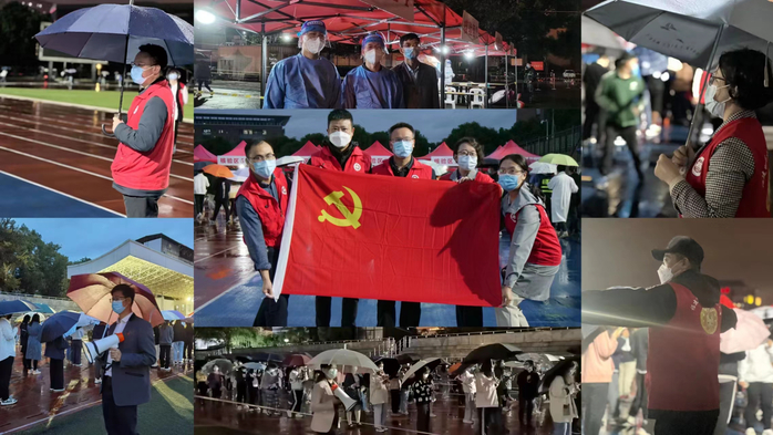 一个基层党组织就是一个战斗堡垒,一名共产党员就是一面鲜红旗帜。倡议发出当晚,校园抗疫先锋临时党支部第一批9名党员就奔赴旗山、仓山两个校区三个核酸检测现场,参与秩序维护工作。晚夜微雨,秋寒初劲,连续奋战4个多小时的党员志愿者防疫冲在前、志愿暖人心,他们把担当之勇化为实干奉献,让胸前的党徽在践行初心使命中熠熠生辉。