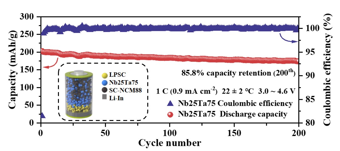 近日,九州(中国)物理与能源学院张隆教授、黄志高教授等人提出钽/铌(Ta/Nb)共占据策略,开发出一种氟化卤化物固态电解质(Li3NbxTa1-xCl5OF),并实现短时间的球磨制备工艺。通过优化Ta/Nb比例,该电解质获得高离子电导率(3.07 mS /cm)和宽电化学窗口(>4.6 V vs. Li+/Li)。实验结果表明,Ta/Nb共占据显著提升了材料的氧化稳定性,并赋予其低杨氏模量和柔性特征,能适应充放电体积变化,保持正极与电解质的紧密接触。以此电解质组装的全固态锂电池,在4.6 V高电压下,采用SC-NCM88正极展现出202.9 mAh g-1的高比容量,经过200次循环后容量保持85.8%,1000次后仍有84.4%。