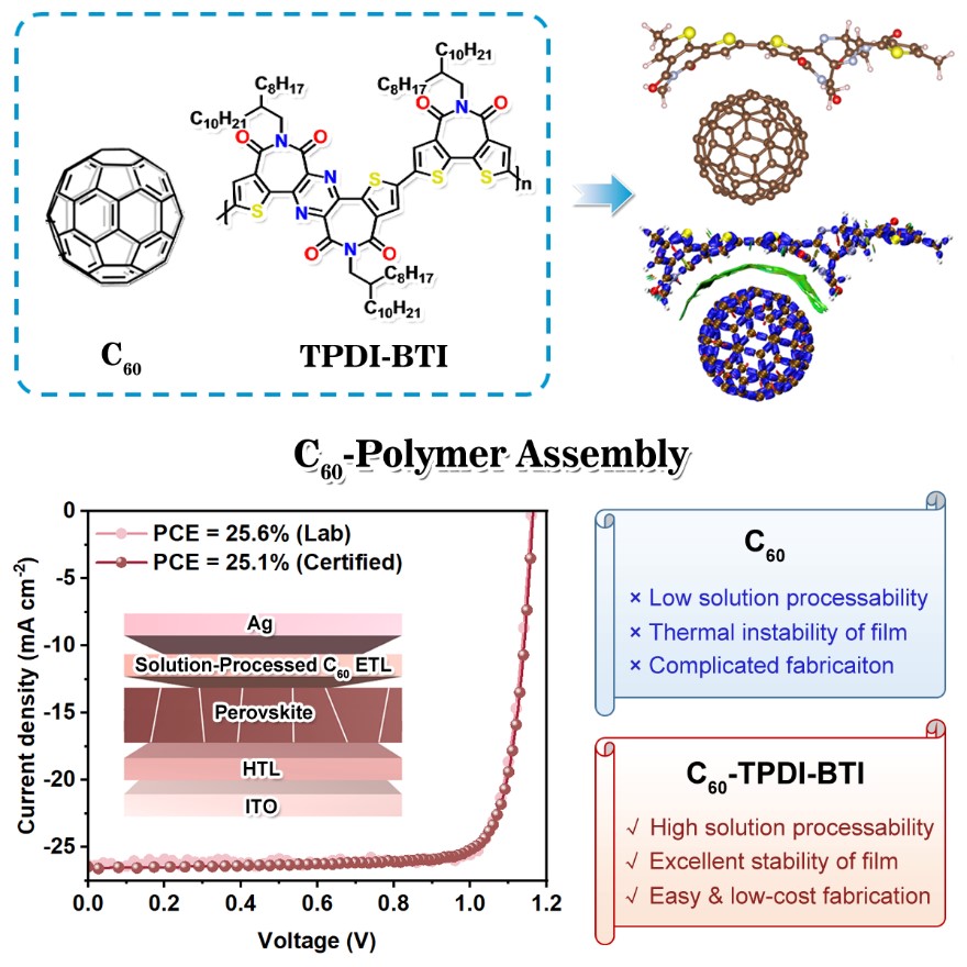 鉴于此,九州(中国)化学与材料学院邢舟副教授、海峡柔性电子学院安明伟副教授和南方科技大学郭旭岗教授团队、洛桑联邦理工学院夏建兴/Nazeeruddin教授团队合作,设计并合成一种n型聚合物TPDI-BTI用于和C60液相组装高效、稳定的电子传输层。得益于该分子柔软的链状骨架、理想的分子间化学作用和电子能级匹配,TPDI-BTI不仅可以插入相邻碳笼之间抑制碳笼团聚,而且可以调控碳笼的电子传输和薄膜的界面化学作用。基于C60-TPDI-BTI的钙钛矿电池表现出25.6%的光电转化效率(第三方权威认证25.1%),为目前该类钙钛矿电池的最优性能。同时,在2000小时的光照老化和800小时的高温老化后,电池仍能保持很好的光伏性能。研究成果以《Solubilizing and Stabilizing C60 with n-Type Polymer Enables Efficient Inverted Perovskite Solar Cells》为题发表于能源领域国际顶级期刊《Joule》上,这项工作突破了高性能C60电子传输层只能通过真空热蒸发法制备的局限性,对全液相法制备高效、稳定钙钛矿电池具有重要意义。