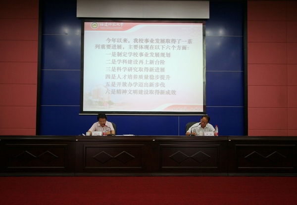 大会于9月13日下午在旗山校区学术大讲堂举行。全体在校校领导,教授,中层干部,各级人大代表、政协委员,各民主党派、统战团体、无党派人士联谊会负责人,离休党总支、关工委、退休协会、老年大学负责人,教代会、工会两委委员,部门工会主席,各系、教研室主任,附属学校党政负责人,机关科级以上干部,各学院分党委(党总支)秘书、团委书记、办公室主任等出席会议。大会由校党委书记罗萤主持。