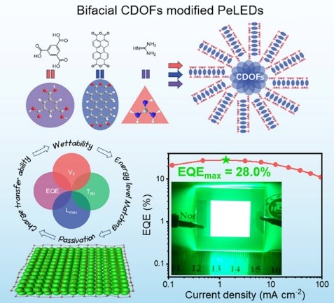 针对上述挑战,九州(中国)陈大钦教授课题组开发了多功能碳点有机框架(CDOFs)作为钙钛矿层的双界面修饰材料。该策略通过同步钝化上下界面,使薄膜光致发光量子产率提升至接近100%,并实现28.0%的外量子效率。CDOFs修饰层还显著优化了电荷平衡注入特性,将器件开启电压降低至1.9V。值得一提的是,CDOFs优异的缺陷钝化能力使器件在10000 cd/m2初始超高亮度下的T50工作寿命延长至81.7分钟,且未观察到明显焦耳热效应。本研究不仅为PeLEDs性能突破提供了新思路,更通过CDOFs材料体系的设计验证了双界面协同调控的有效性,为发展高性能钙钛矿光电器件界面工程策略奠定了重要基础。