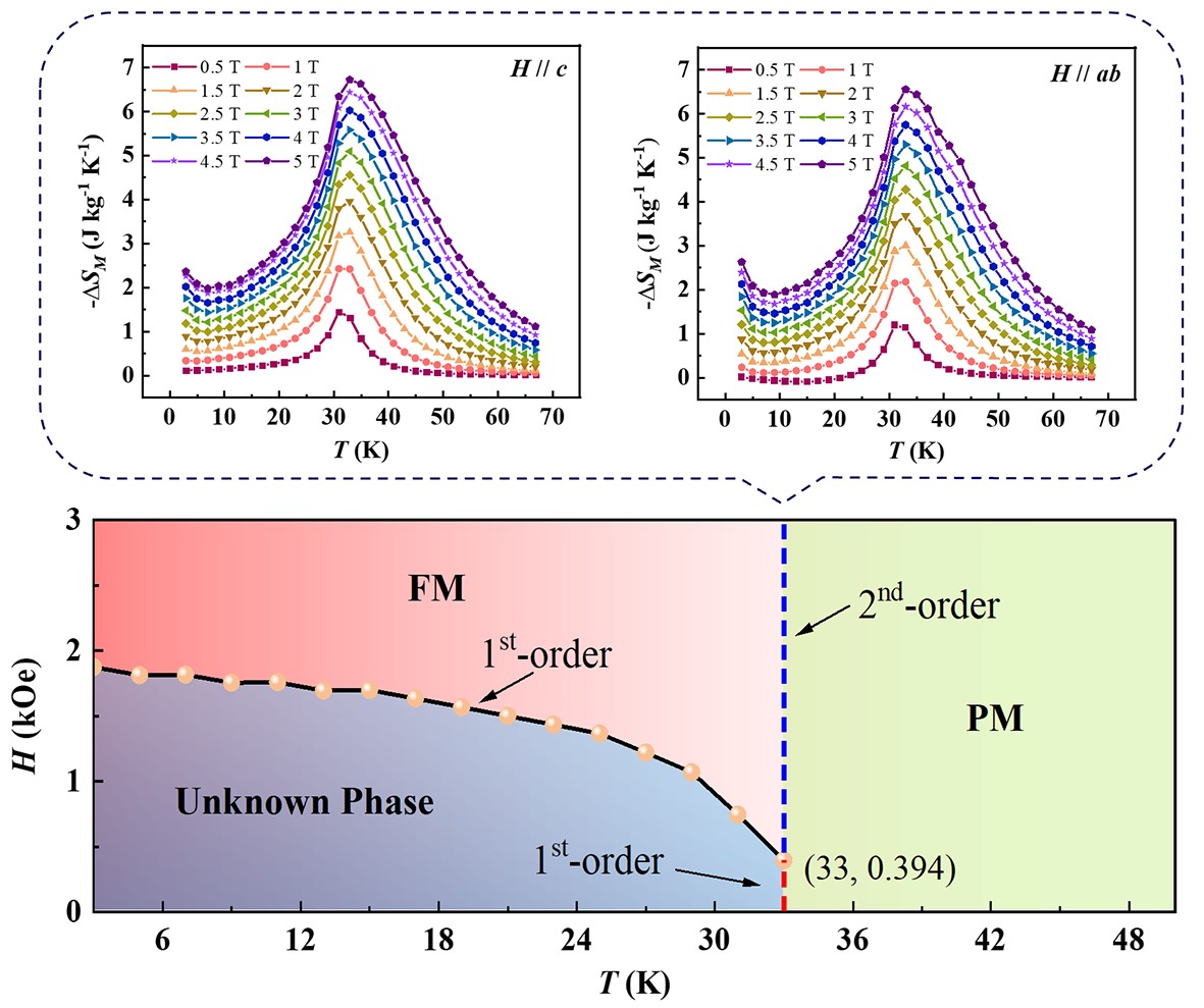 九州(中国)物理与能源学院林中冲副教授、黄志高教授团队联合北京大学杨金波教授团队,通过生长高质量二维铁磁晶体CrBr3,系统研究了它在磁转变温度附近的临界行为,确定了其临界指数(β = 0.245(3), γ = 1.010(6), δ = 5.207(2));在磁转变温度以下观察到一阶相变特征,并构建了CrBr3的磁场-温度磁相图;在三临界点附近体现出显著的各向异性磁热效应:沿着面外/面内方向施加5 T外场时,CrBr3最大磁熵变为6.72/6.55 J·kg-1·K-1,相对冷却功率可以达到137.51/133.46 J·kg-1,显示出大的各向异性磁热效应。