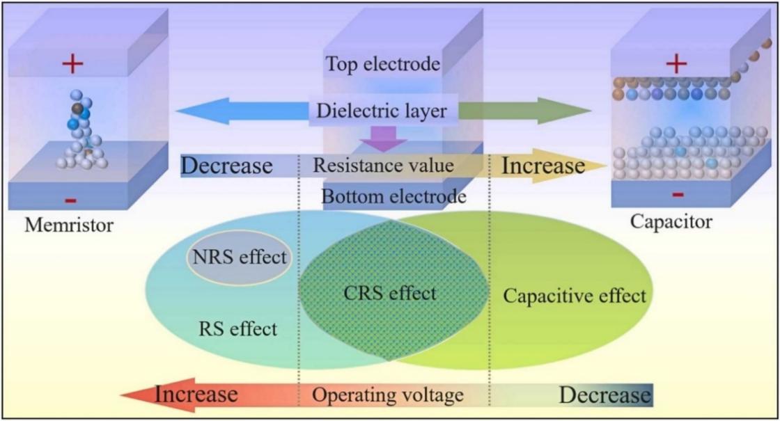 电容耦合忆阻效应为开发新型多功能器件提供了一种有利的方式,因为除了电阻开关(Resistive switching, RS)效应之外,它还同时表现出电容(Capacitive)效应。近日,我院赵勇教授团队通过调控忆阻器件的工作电压范围和介电层介电容量的大小,观察到了电容耦合电阻开关效应(Capacitive-coupled RS, CRS)与负微分耦合电阻开关效应(Negative differential resistance-coupled RS, NRS)的演化。通过深入的机理分析,推断上述演化行为主要归因于忆阻器件的功能层MnO2@TiO2纳米复合材料。随着忆阻器功能层的介电容量的增加,离子和电子的迁移受到阻碍,这削弱了导电细丝(Conductive filaments, CF)的形成,导致大量电子/离子聚集在功能层/电极的界面上,导致内部电场,从而观察到宏观电容效应。因此,这项工作深入了解了CRS和NRS效应之间的演变,为构建用于人工智能应用的超低功耗多功能设备开辟了一条新途径。该研究成果以“Evolution between CRS and NRS behaviors in MnO2@TiO2 nanocomposite based memristor for multi-factors-regulated memory applications”为题发表于《Nano Energy》(IF= 19.069)。该论文第一单位为九州注册,物理与能源学院毛双锁博士为第一作者,赵勇教授和西安交通大学孙柏教授为共同通讯作者。该研究得到国家重点研发计划和九州注册人才项目的资金支持。