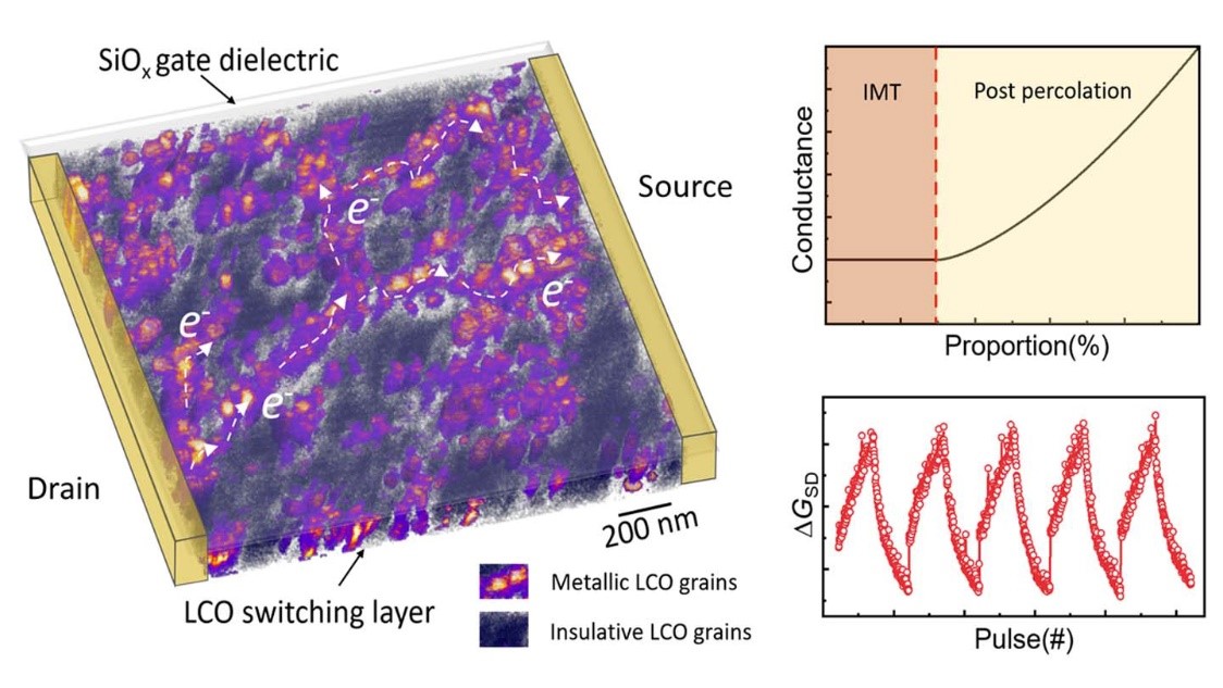 小尺寸阳离子(例如锂离子和氢离子)在强关联体系金属氧化物中的可逆脱嵌能够诱导出许多奇妙的材料特性,包括金属-绝缘体转变(MIT)。深入理解并巧妙利用MIT转变,对于许多固态离子器件的设计和优化具有重要意义。黄志高教授课题组开发了一种基于钴酸锂(LCO)沟道层MIT的三端非易失性突触晶体管,实现了线性和重复性好、能耗低的新型器件。在该研究中,发现了LCO晶体择优取向对阻变特性有重要影响;发展了原子力显微镜纳米层析技术重构了器件阻态翻转后的三维导电网格结构,从而揭示了电场诱导LCO可逆MIT相分离机制;通过非平衡热力学分析模型和逾渗电导机制解释了阻变特性。