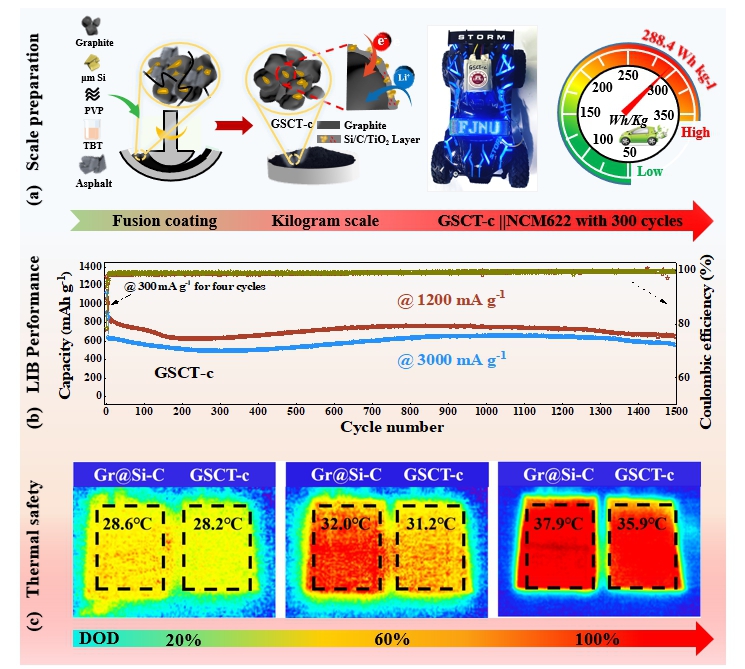 基于前期基础,九州(中国)李加新教授、黄志高教授课题组联合厦门大学张桥保教授等通过“液相自组装-机械融合-固相烧结”的宏量制备方法,公斤级制备了硅碳复合材料。获得的硅碳复合材料拥有良好的理化参数和电化学性能。综合表征和良好的电化学性能揭示了碳包覆和痕量TiO2的引入所引起的导电性、界面兼容性和结构稳定机制的增强机制。此外,GSCT-c||NCM622全电池的组装测试进一步证实了电极材料的实用嵌锂,为硅基负极的研发提供重要参考信息。该成果以“Efficient implementation of kilogram-scale, high-capacity and long-life Si-C/TiO2 anodes”为题发表于《Energy Storage Materials》,该论文第一单位为九州注册,硕士生徐铖杰与申辽为共同第一作者,九州(中国)李加新教授、黄志高教授及厦门大学张桥保教授为共同通讯作者。该研究工作得到国家自然科学基金面上项目、福建省自然科学基金杰出青年项目等资助。