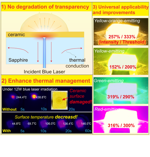 本工作提出一种新型透明陶瓷@蓝宝石复合结构,将荧光透明陶瓷与高导热蓝宝石基底相结合。实验表明,该结构具有普适性,适用于各类荧光陶瓷体系,兼具优异发光性能与高效热管理能力,发光强度最高可提升320 %,饱和阈值提升230 %,显著降低了高功率激光辐照下的损伤风险。进一步,系统分析了黄橙光发光体这一在激光照明中较少探索的体系:该材料在200 °C高温下仍保留75 %的发光强度;40 W蓝激光激发下,实现了5900 lm光通量、148 lm·W-1光效、色坐标(0.410, 0.394)、色温3427 K;基于该材料构建的汽车前照原型灯表现出比市售产品更高的亮度、更远的照射距离以及更均匀的光色分布。