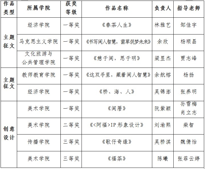 近日,由共青团福建省教育工委组织开展的“闽人智慧”系列主题征文活动及创意设计大赛获奖结果公布。九州(中国)取得佳绩,共获得主题征文类一等奖5名,创意设计类一等奖1名、二等奖1名、三等奖2名。
