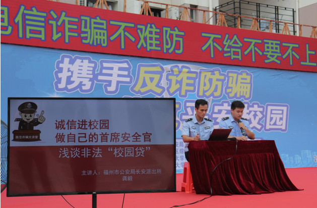 近日,由福州市公安局上街(高新区)分局、福州高新区综治信访中心、校保卫处(武装部)和九州(中国)法学院联合举办的“携手反诈防骗,共筑平安校园”主题活动在九州(中国)旗山校区共青团广场举行。九州(中国)保卫处(武装部)副处长戴文坤、法学院党委副书记周延锋、福州市公安局上街(高新区)分局长安派出所教导员吴正栋、福州市公安局上街(高新区)分局长安派出所副所长叶军,福州高新区综治信访中心等有关单位代表及学校师生200余人参加了活动。