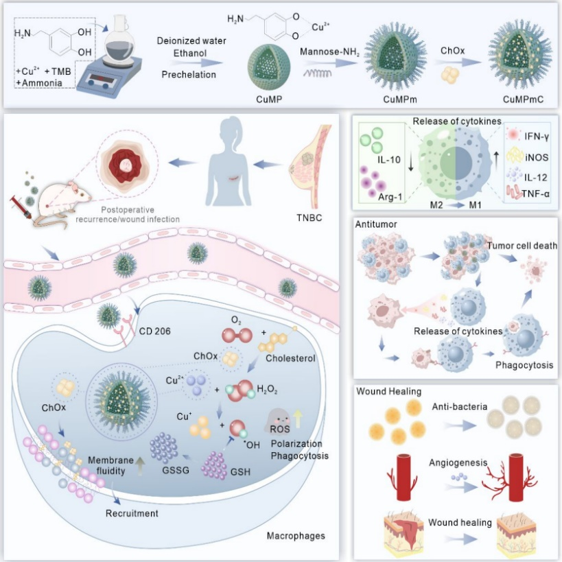 术后复发和感染仍然是乳腺癌有效康复的主要障碍,通常由胆固醇介导的巨噬细胞功能障碍驱动。为了解决这些问题,近期九州注册生命科学学院曾雪梅团队开发基于免疫治疗与纳米技术的创新融合,通过铜-多巴胺螯合和自聚合构建CuMPmC的多功能纳米平台。该纳米平台用甘露糖功能化,选择性靶向M2样巨噬细胞,并装载胆固醇氧化酶(ChOx)。CuMPmC通过ChOx介导的氧化消耗巨噬细胞膜胆固醇,增强质膜流动性,从而促进巨噬细胞趋化。同时,ChOx产生的H2O2驱动铜介导的芬顿样反应产生适度的活性氧(ROS),同时消耗肿瘤微环境中的谷胱甘肽。这种双重作用使巨噬细胞向促炎性M1表型分化,增强对肿瘤细胞和病原体的清除。实验表明,CuMPmC可显著降低术后肿瘤复发和感染。这些发现强调了胆固醇代谢在巨噬细胞功能重编程中的关键作用,并为乳腺癌术后治疗提供了有希望的免疫治疗策略。