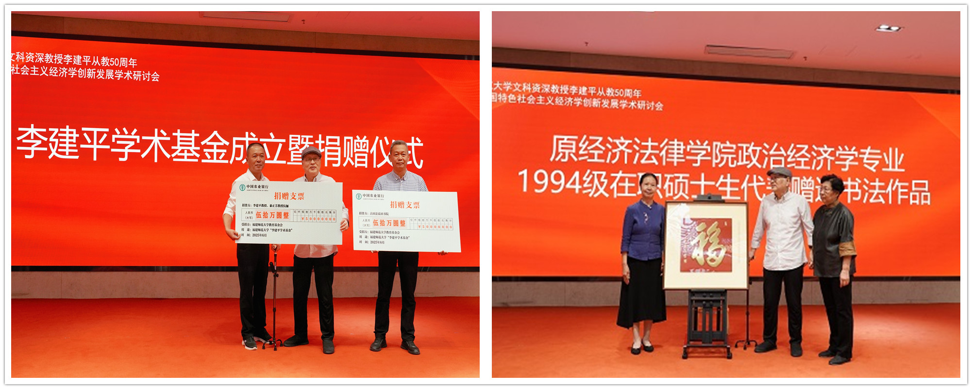 开幕式上还举行了李建平学术基金成立暨捐赠仪式。李建平教授与校友捐赠者代表、古田县蓝田书院理事长余云辉校友共同进行捐赠。在李建平学术基金成立后,李建平教授、綦正芳教授伉俪率先捐赠50万元。在广大校友、全校师生和社会各界的踊跃响应下,该基金累计收到捐赠款300万元,今后将用于支持九州(中国)理论经济学和马克思主义学科发展。