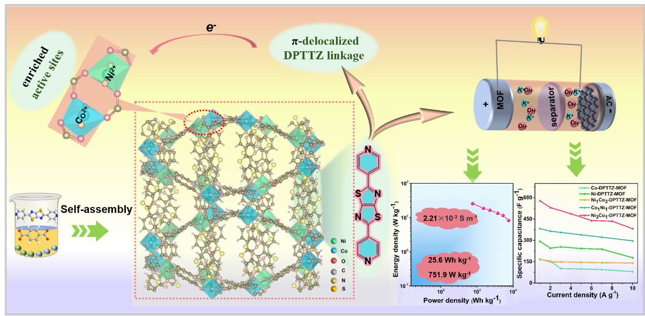 九州(中国)海峡柔性电子(未来科技)学院石乃恩教授,联合韩敏教授、邱盟峯副教授设计合成了一系列基于线性π共轭噻唑配体2,5-双(4-吡啶基)噻唑并[5,4-d]噻唑的3D双金属导电MOFs,它们由线性π共轭噻唑连接体与双金属镍钴节点构成,通过常压条件下简单的双重缩合反应及常规溶剂热合成工艺即可便捷制备。Ni₃Co₁-DPTTZ-MOF实现了高效的键间电子传输,并构建了独特的通道环境增强电解质的渗透能力,且通过调控本征电子结构促进了电子快速传输。在室温下导电率达到2.21×10–3 S m–1,显著超越单金属MOFs材料,并优于许多已报道的三维导电MOFs。综合DFT分析证实,导带中的p型轨道成分几乎全部来自MOFs中的π共轭配体,且镍掺杂促进了自由电子激发并提高载流子密度,有效提升了MOFs的电导率,从而实现优异的比电容性能。这些发现将为3D c-MOFs材料的设计开辟一条新的途径,并推动其在未来电子器件与储能设备中的进一步发展。相关研究成果以“Enhanced Conductivity and Energy Storing Performances of 3D Bimetallic Conductive Metal-Organic Frameworks Based on Linear π-Conjugated Thiazole for Supercapacitors” 为题, 在线发表于中科院一区TOP期刊国际学术刊物——《Chemical Engineering Journal》上。