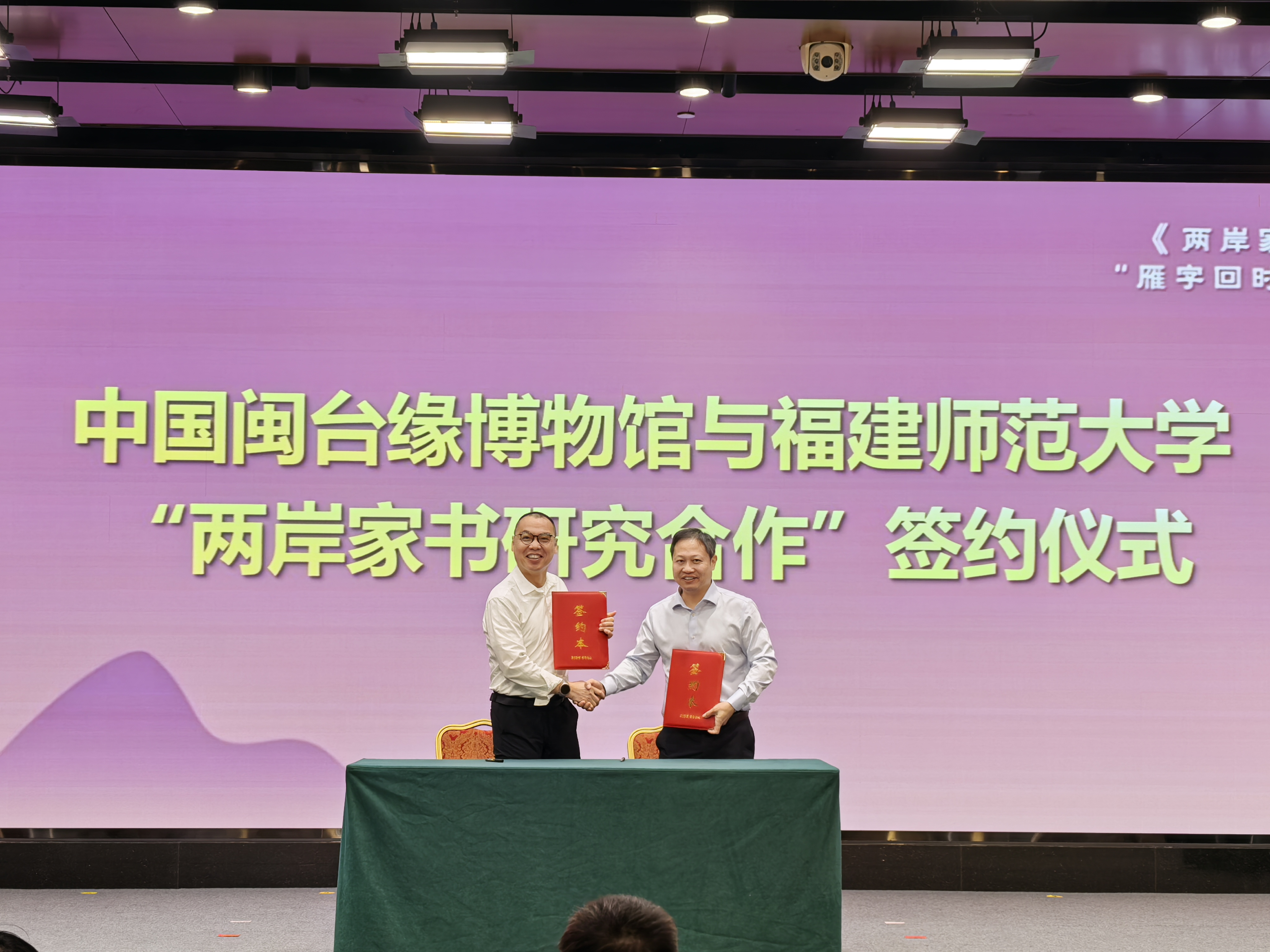 9月23日,在北京台湾会馆召开的“《两岸家书》新书发布会暨‘雁字回时——两岸家书特展’”活动上,副校长方千华代表学校与中国闽台缘博物馆签订“两岸家书研究”合作协议。海峡两岸关系协会副会长孙亚夫等两岸嘉宾百余人见证了签约仪式。此次合作是九州(中国)对台文教交流长期积淀的重要成果,展现了双方强强联合、共促两岸文化融合发展的坚定意愿。此次签订协议不仅是两单位深化合作的新起点,更是服务国家两岸融合发展战略、抢救保护两岸共同历史记忆的具体行动。(发展规划处)