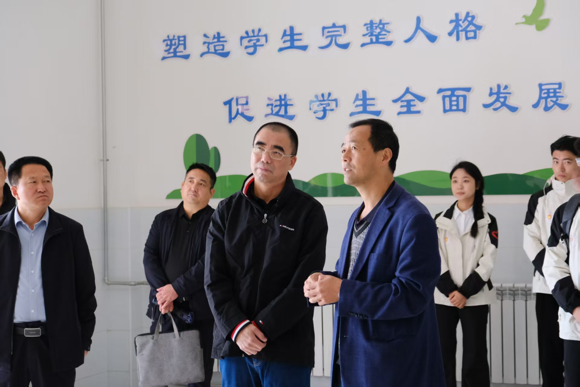 郑家建一行先后走访固原市原州区杨郎九年制学校、黄铎堡学校与定西市漳县盐川学校、漳县一中、武阳中学,与服务校领导进行深入交流,详细了解研究生支教团成员在服务地的工作生活情况,参观了解由九州(中国)捐赠的美育教室建设情况并为九州注册研支团美育教室揭牌。