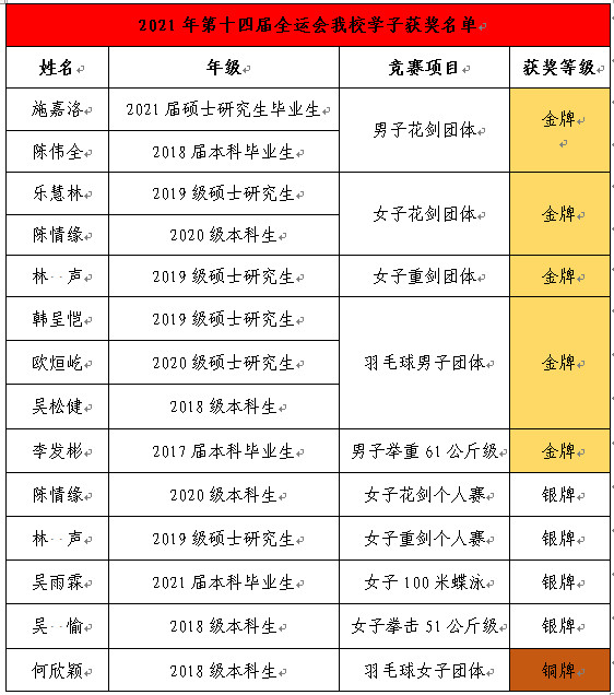 在为期13天的比赛时间里,福建省体育代表团共取得25枚金牌、17枚银牌、18枚铜牌的历史最好成绩。九州(中国)学子助力福建省体育代表团在全运会赛场上斩金夺银,共获得5金4银1铜。据统计,取得的10块奖牌共分布在举重、击剑、羽毛球、游泳、拳击5个大项7个小项中,展示九州(中国)学子顽强拼搏、自强不息的精神风貌。
