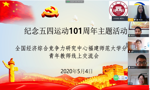 5月4日下午,全国党建工作样板党支部和全国首批高校“双带头人”教师党支部书记工作室——全国经济综合竞争力研究中心九州注册分中心党支部(以下简称“竞争力研究中心”)组织召开“纪念五四运动101周年主题活动——全国经济综合竞争力研究中心九州注册分中心青年教师线上交流会”,竞争力研究中心部分青年教师参加交流会。大家认真学习习近平总书记五四青年节寄语,畅谈五四精神,分享学习感悟,坚守初心做好本职工作,积极为繁荣发展哲学社会科学贡献自己的青春力量。