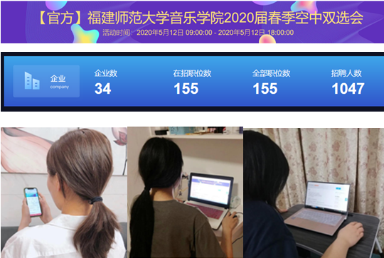 为减少疫情对就业工作的影响,音乐学院持续推进“就业云服务”工程,千方百计为毕业生就业创造条件。今年3月以来,学院通过组建招聘信息搜集团队、开设就业直通车小程序等一系列措施,在学院微信公众号推送300余条招聘资讯,举办线上就业指导活动10余场。