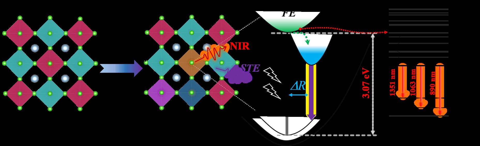 基于此,具有低毒性和优异稳定性的无铅卤化物双钙钛矿被认为是稀土掺杂产生近红外发射的理想基体。课题组通过Na+/Bi3+共合金化实现Nd3+掺杂Cs2AgInCl6的局域结构调控,首次实现自陷激子发射和Nd3+近红外发射的同时增强。与不含Na+/Bi3+样品相比,其发光强度提高了648倍,近红外发光量子效率从0.16%显著提高到30.3%。这归因于Na+/Bi3+合金化诱导的协同效应,包括:局域占位对称性的调节、宇称禁戒吸收的破坏和电-声耦合的降低,进而导致通过自由激子而非自陷激子有效敏化Nd3+发射。