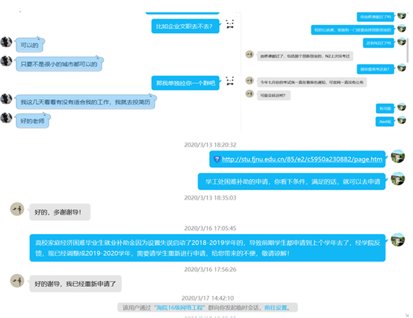 精确帮扶特殊群体。学院为学业困难、家庭经济困难、“慢就业”心态等特殊毕业生群体开展就业心态疏导和就业技能指导,引导考研同学做好就业规划,就业考研“双管齐下”;先后为湖北籍、家庭经济困难学生、异地求职学生等发放求职补贴20800元;帮助自主创业学生联系合作企业,给予创业启动资金。