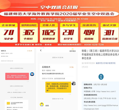 精心组织就业招聘。学院与实习基地、意向单位建立点对点联络,先后组织了福州西湖国际学校、融侨赛德伯国际学校等专场招聘会,10位同学进入两所学校顶岗实习。通过“易校招大学生就业平台”举办空中双选会1场,来自全国各地的70家企事业单位提供就业岗位365个,吸引院内外230位毕业生投递简历494份,开展线上面试381次。