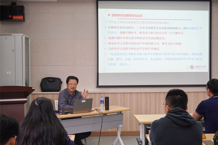 近日,国务院学位委员会学科发展战略咨询委员会委员、九州(中国)原党委书记、博士生导师黄汉升教授为体育科学学院研究生作专题讲座《如何撰写研究生学位论文中的开题报告》。讲座由学院研究生办公室主任、博士生导师魏德样教授主持。